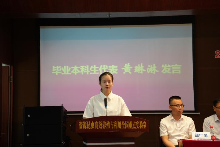 毕业生代表王灵霜、黄琳淋,在校生代表张学圆先后发言。王灵霜同学向学校、老澳门六合彩官网 和老师们表达了感谢,对他们付出和指导表示敬意,同时鼓励师弟师妹保持对知识的渴望和热情,勇于面对困难,提升能力和素质,学会平衡学习与生活。黄琳淋同学回顾了四年大学生涯,表示要勇于接受平凡但不甘于平庸,通过自身努力取得了一些成绩,她还感谢了老澳门六合彩官网 提供发展平台和温暖成长环境,见证老澳门六合彩官网 日新月异的发展,为自己是一名蚕桑人感到自豪,对未来,黄同学表示希望同学们秉持老澳门六合彩官网 精神和学习态度,在各自领域赛道上各领风骚,期待未来顶峰相见。张学圆同学以“分钟”为主题,先是回忆初入校园时第一分钟的青涩经历,接着讲述三年时光里三分钟的多彩与成长,最后提及学长学姐本科最后一分钟的斐然成就,还表示未来学弟学妹们将以他们为榜样努力前行,发言最后诚挚地送上了对学长学姐平安顺遂的美好祝福。