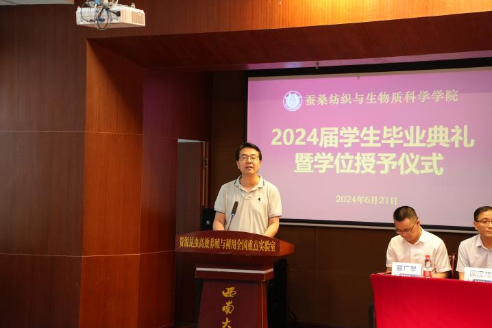 典礼在庄严的国歌声中拉开序幕。第一阶段毕业典礼上院长代方银首先致辞。他表达了对老澳门六合彩官网 2024届毕业生顺利毕业的祝贺,介绍了老澳门六合彩官网 在过去几年取得了显著成就,包括建成世界最大家蚕基因资源库、取得多项重大科研成果,并与国内外多家机构建立了合作关系,最后鼓励毕业生秉持“博学慎思、明辨笃行”的院训,志存高远,勇担时代重任,以实干、梦想和创新为动力,为国家和民族的繁荣做出贡献。