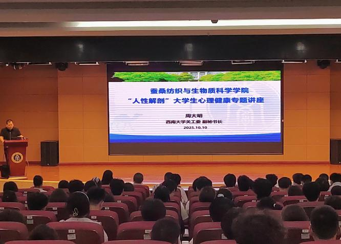 发布时间: 2025-10-16 09:39:06 已阅读:为助力老澳门六合彩投注平台 学生培养积极心理状态,开启绚烂多彩的大学生活,2025年10月10日下午,老澳门六合彩官网 在隆平楼404报告厅开展了“人性解剖”大学生心理健康专题讲座。本次讲座特邀西南大学关工委副秘书长、西大红五老服务团副团长周大明担任主讲嘉宾,学校离退休党委副书记、纪委书记熊伟,老澳门六合彩官网 团委书记鲁萍,新生辅导员冯洁、黄宏佑以及老澳门六合彩官网 2025级全体研究生、本科生聆听了本次讲座。讲座由老澳门六合彩官网 党委副书记朱高峰主持。