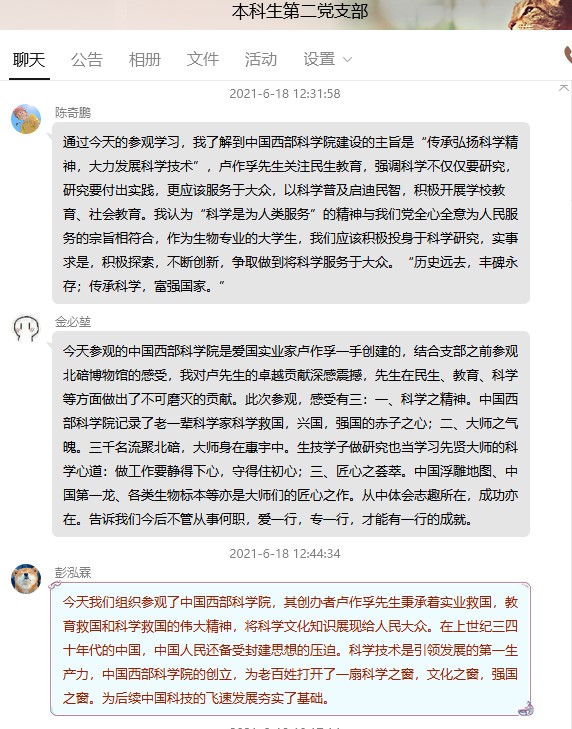 参观之后,同志们在惠宇楼内为孙小桐等3位党员过了政治生日,赠送了生日贺卡和《袁隆平传》书籍。随后,在支部书记朱高峰的主持下,同志们就本次参观学习展开了积极的线上交流和讨论,纷纷发表自己的所思所感,大家对求真务实、科教兴国等方面都有了更加深刻的认识。