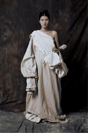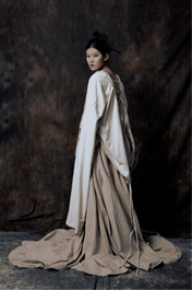 系列作品名为《宋汝》,探究的是如何将时代的脉络映射到服装上。设计师陈虹颖认为“南宋是一个富而不骄、知文知雅的时代,水大概是对这个时代最好的诠释”。该系列设计以南宋山水画中的水纹为设计灵感,模拟水的形态,将其铺展到服装上。以水为形,以现代女装为主体,以南宋汉族女子服装结构为主要元素,采用具有悠久历史和深厚文化底蕴的丝绸作为材料,运用立体剪裁,多种结构和材料造型方法,勾勒南宋绘画艺术,塑造现代女装的南宋底蕴,给观者耳目一新的创新感。