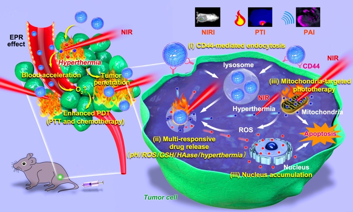 在此,该合作团队开发了一种结合癌症成像示踪与靶向治疗的诊疗一体化纳米鸡尾酒诊疗法,将具有线粒体靶向功能的ICG类似物(NIR770)和抗癌药物阿霉素(DOX)共载于丝素蛋白纳米粒子,并利用透明质酸(HA)对其表面进行功能化。实验表明,所获得的纳米粒子HNDNPs具有明显的酸性pH、H2O2、GSH、高温和透明质酸酶(HAase)五重刺激响应性。抗肿瘤实验结果表明,在NIR照射下实现了高效的多模态成像指导下的PTT- PDT和化疗协同治疗,具有比单一疗法更好的治疗效果。这种兼具肿瘤细胞靶向、线粒体靶向、五重刺激响应性、多模态成像、光疗和化疗等功能于一体的纳米鸡尾酒诊疗法,可以为下一代癌症靶向协同诊疗方案提供了新的设计思路。