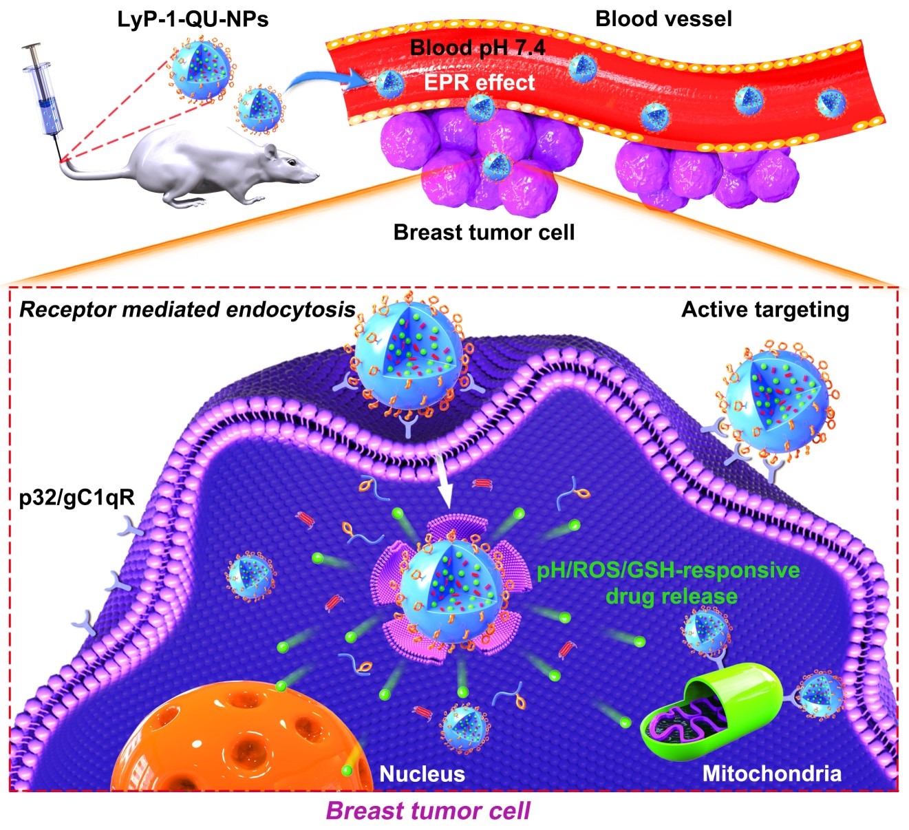 8月31日,Journal of Controlled Release在线发表了题为“Inhibition of growth and lung metastasis of breast cancer by tumor-homing triple-bioresponsive nanotherapeutics”的研究性论文。肖波教授、代方银教授和四川大学华西医院柯博文教授为该论文共同通讯作者,家蚕基因组生物学国家重点实验室为第一单位。LyP-1多肽(CGNKRTRGC)是一种对肿瘤细胞、肿瘤淋巴管内皮细胞、肿瘤细胞内线粒体有特异性亲和作用的环状九肽。槲皮素(QU)是一种天然的黄酮类化合物,广泛存在于多种植物的花、叶和果实中,具有抑制肿瘤生长、调控肿瘤相关信号转导通路和逆转多药耐受等功能。然而,QU的水溶性差、代谢迅速和生物利用度低的问题限制了其临床转化。基于此,该团队设计了一种兼具肿瘤细胞和线粒体靶向的LyP-1修饰载槲皮素纳米药物。体外研究发现该纳米药物(LyP-1-QU-NPs)能通过破坏线粒体功能、抑制肿瘤细胞迁移、抗糖酵解和促进肿瘤细胞自噬等途径抑制乳腺癌的生长和转移(图2)。后续研究还发现LyP-1-QU-NPs不仅具有优异的生物安全性,并且能缓解肿瘤生长和恶性转移,从而显著提高小鼠生存期。