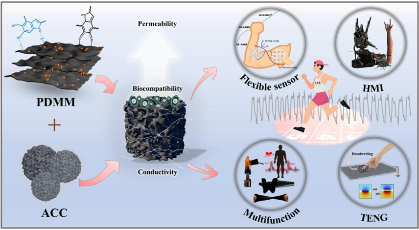 随着智能终端的普及,由导电水凝胶组装而成的柔性可穿戴电子元件在实时健康监测、临床诊断、医疗以及人机交互传感等领域的应用潜力愈发显著。然而,目前能够实现超高灵敏度的多孔凝胶材料通常存在网络孔隙结构不均匀、能量耗散机制匮乏、结构易塌陷和抗疲劳性较差等问题。张同华教授和陈磊副教授团队受生物矿化过程及奥斯特瓦尔德(Ostwald)熟化理论的启发,通过一锅法快速制备了一种电子-离子协同作用、具有多级孔结构的P(AM-CO-AA)-PDMM晶体水凝胶。该项研究中,丙烯酰胺和丙烯酸单体作为水凝胶基体,无机离子增稳的无定形碳酸钙用作功能填料和稳定的分散剂,多巴胺修饰的MXene“一石三鸟”充当交联剂、导电填料和增强体。多孔晶体水凝胶表现出出色的韧性(28 MJ/m3)、良好的导电性(4 s/m)、优异的传感性能(灵敏度和测量因子分别高达0.43 kPa-1和58.64)、宽检测范围(拉伸范围1–400%,压缩范围0–43 kPa)和快速响应恢复时间(500 ms和400 ms),同时兼具卓越的透气性、阻燃性和生物相容性。此外,该水凝胶可用作柔性电极准确收集和识别人体生理信号,以及组装成单电极摩擦纳米发电机进行能量收集,在自供电智能穿戴设备中显示出巨大潜力。