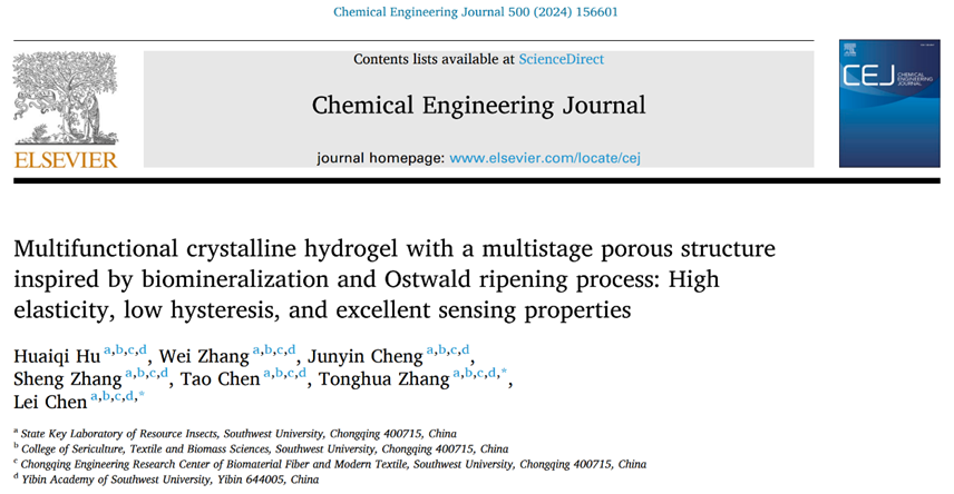 发布时间: 2024-10-19 13:48:08 已阅读:近日,老澳门六合彩投注平台 张同华教授和陈磊副教授课题组在化学工程领域知名期刊《Chemical Engineering Journal》(IF:13.3)发表了题为“Multifunctional crystalline hydrogel with a multistage porous structure inspired by biomineralization and Ostwald ripening process: High elasticity, low hysteresis, and excellent sensing properties”的研究论文。
