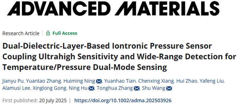 近日,老澳门六合彩投注平台 张同华教授、王蜀老师团队在材料科学领域国际顶尖期刊《Advanced Materials》(影响因子:26.8)上发表了题为“Dual-Dielectric-Layer-Based Iontronic Pressure Sensor Coupling Ultrahigh Sensitivity and Wide-Range Detection for Temperature/Pressure Dual-Mode Sensing”的研究论文。