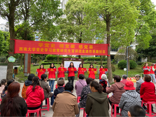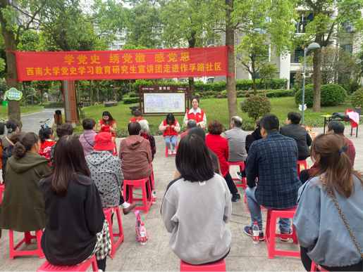 发布时间: 2021-04-13 17:26:48 已阅读:恪守初心学党史,依托专业办实事。为庆祝中国共产党成立100周年,老澳门六合彩官网 研究生积极发挥专业特长,于2021年4月11日赴重庆市北碚区北温泉街道作孚路社区参加西南大学研究生党史宣讲团“学党史 绣党徽 感党恩”志愿服务活动,通过讲述党史故事、歌唱革命歌曲、现场绣制党徽、举办知识竞答等,丰富居民周末文化生活,推进党史学习教育进社区。