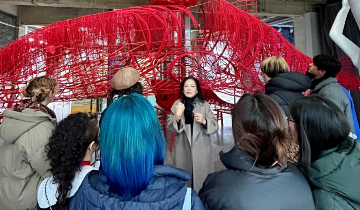 溯古观今,项目组师生还拜访了中国著名服装设计师、当代艺术家梁明玉教授工作室,在梁教授的带领下参观了她的系列环保作品,了解了环保这一全球命题上中国当代艺术家的立场和声音。